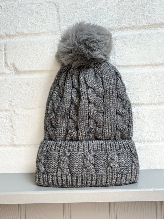 Cable Knit Fleece Lined Pom Hat | Grey