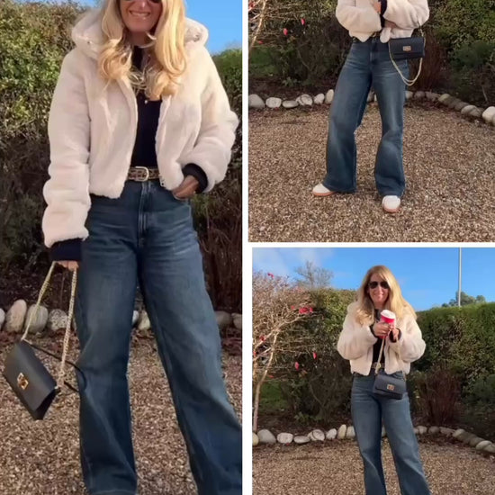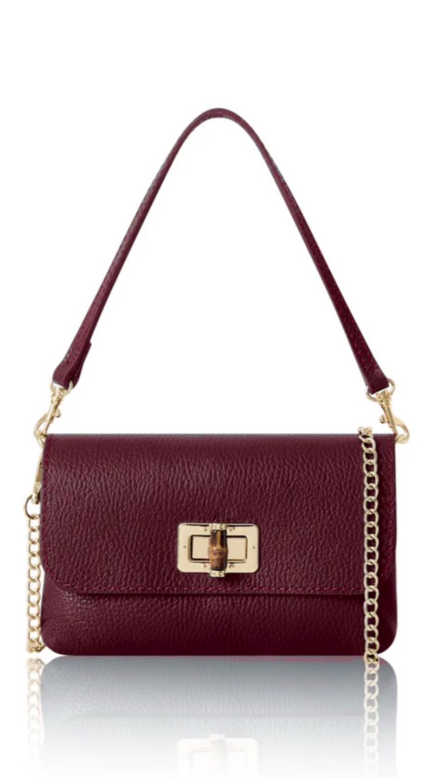 - 3-in-1 styling – carry by the short leather handle, wear crossbody with the detachable gold chain strap, or style as a sleek clutch