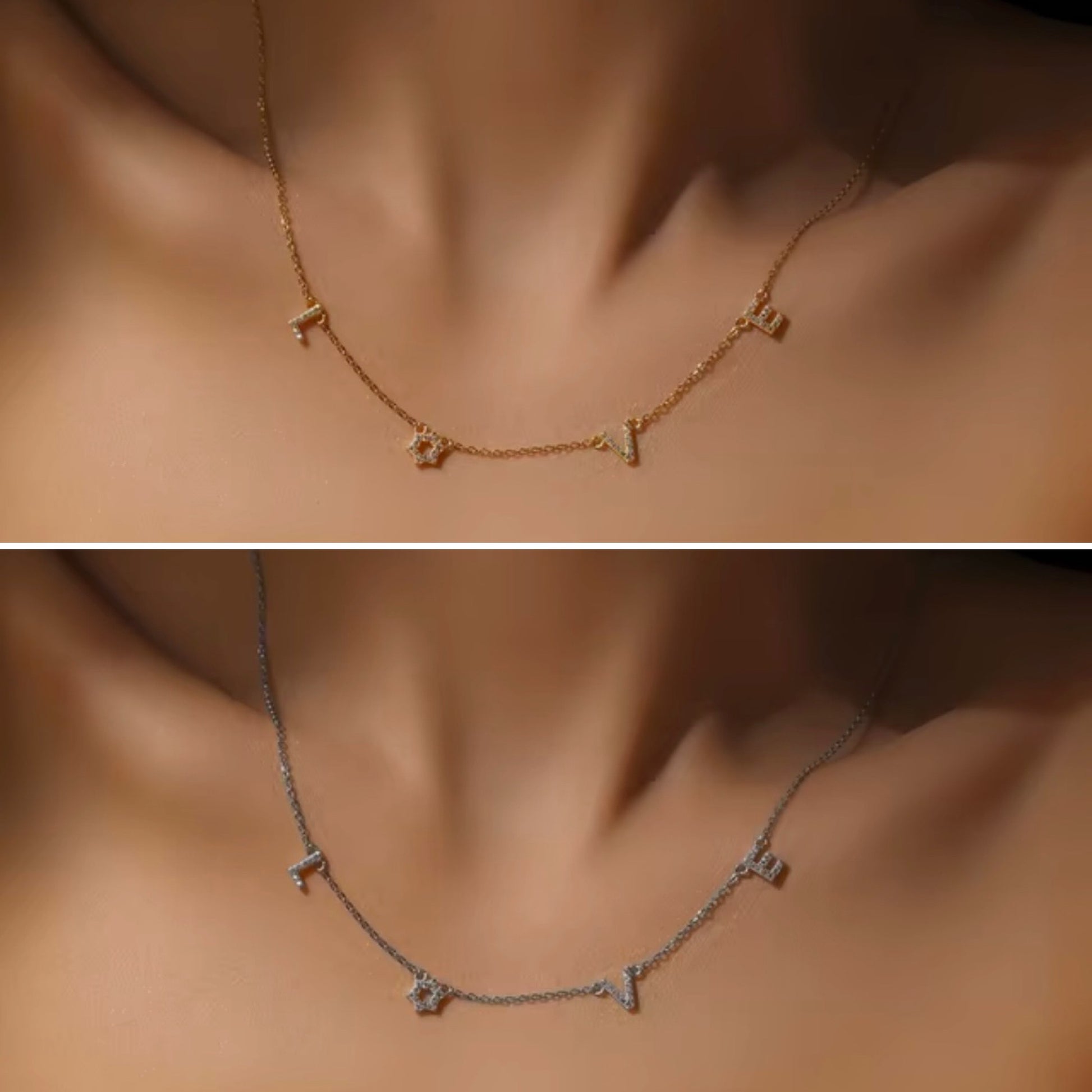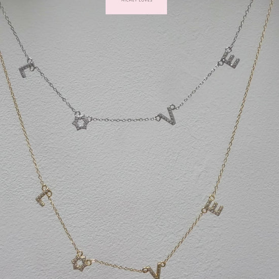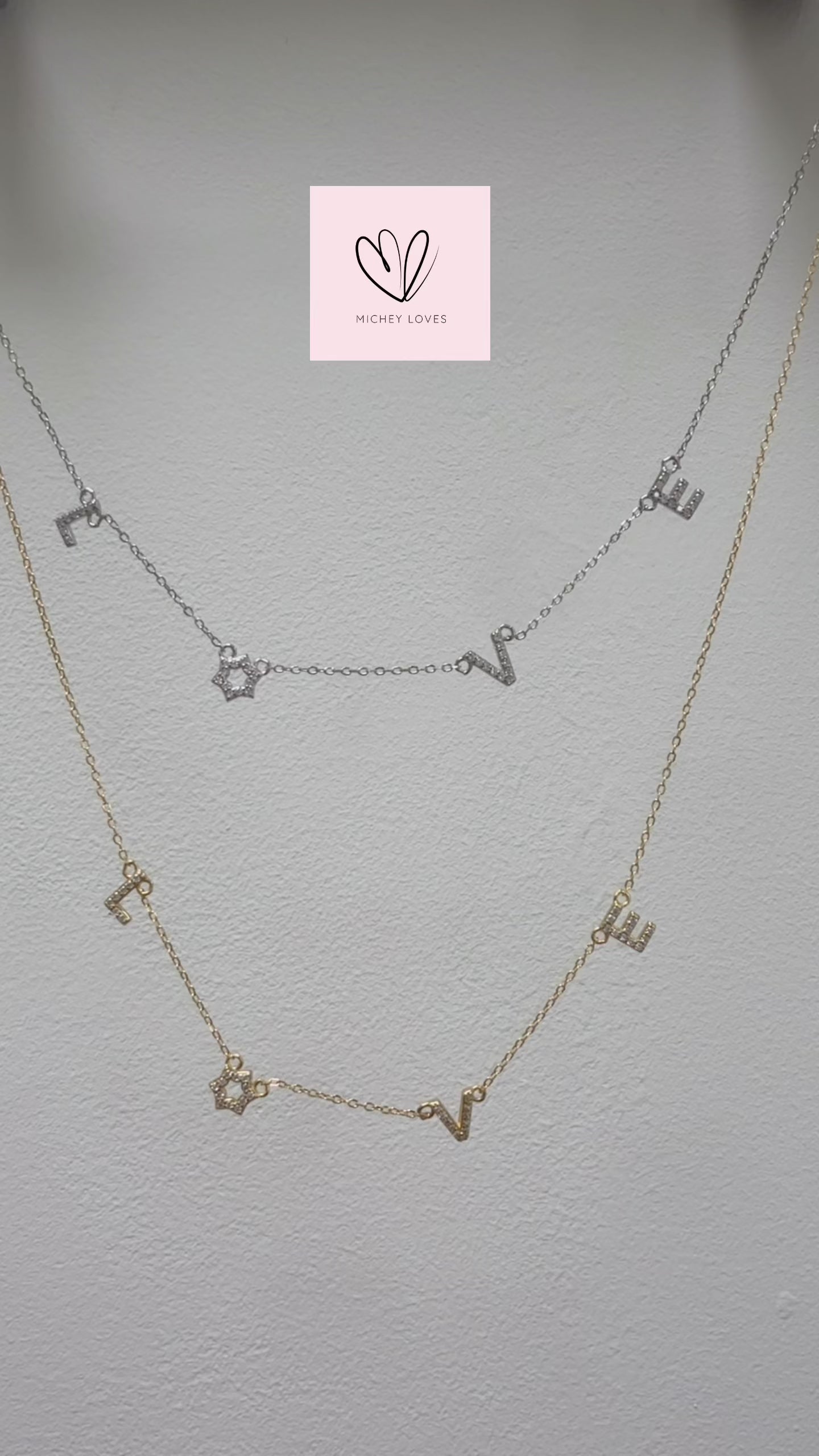 This elegant necklace beautifully spells out LOVE, with the “O” replaced by a shimmering Star of David.