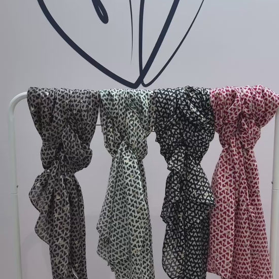 Add a romantic finishing touch to your wardrobe with the Sasha heart print scarf. Crafted from a soft blend of viscose and cotton, this lightweight yet cosy scarf features a playful mix of black hearts and metallic gold hearts on a taupe base. Perfect for year-round styling, it layers beautifully over casual looks or can be draped elegantly for evening wear.