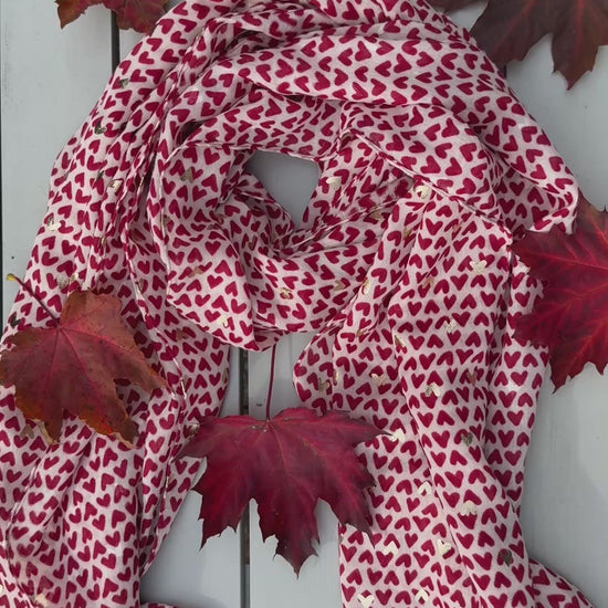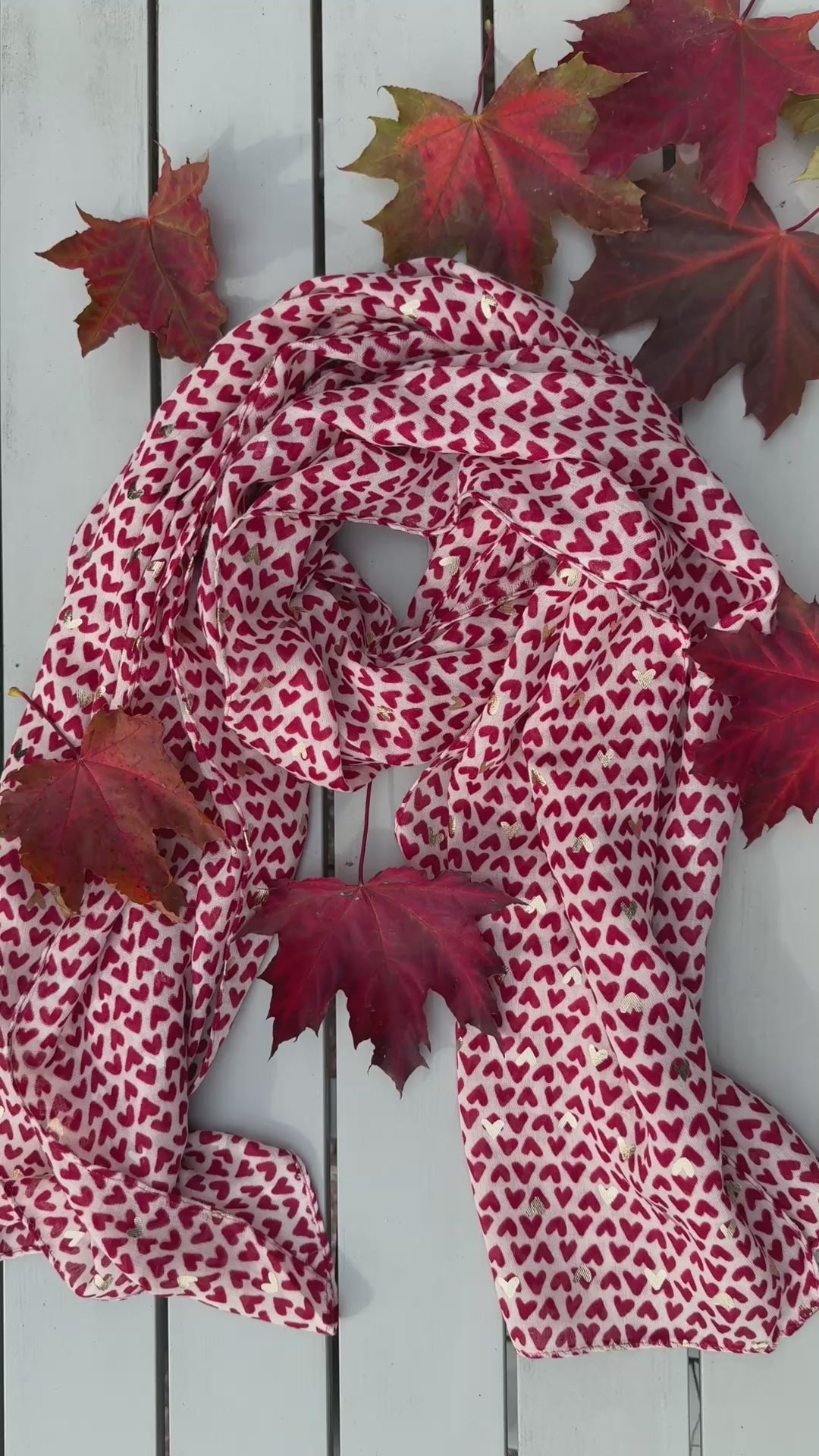Add a romantic finishing touch to your wardrobe with the Sasha heart print scarf. Crafted from a soft blend of viscose and cotton, this lightweight yet cosy scarf features a playful mix of berry hearts and metallic gold hearts on a cream base. Perfect for year-round styling, it layers beautifully over casual looks or can be draped elegantly for evening wear.